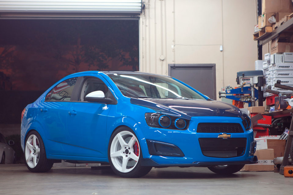 The Tjin Edition Chevrolet Sonic was built in conjunction with General Motors and debuted in the GM booth at the 2011 SEMA Show. Going for a performance theme, a huge front mount intercooler, Unique Fabrication roll cage, Baer brakes and light weight Forgestar wheels were added.